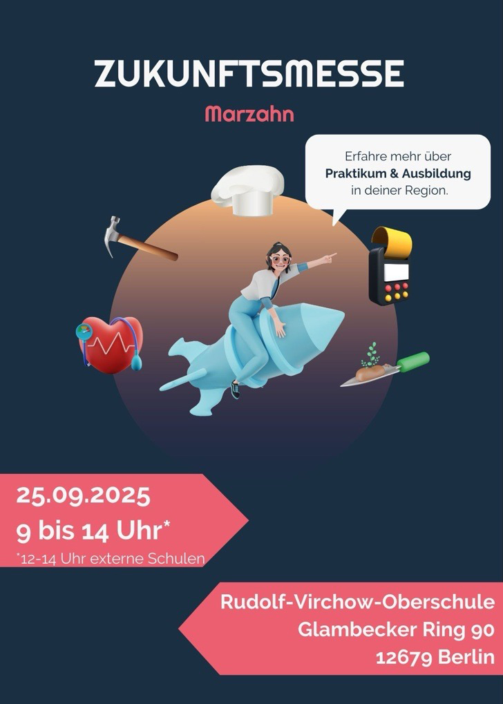 Am 25.09.2025 findet zum zweiten Mal die Zukunftsmesse an der Rudolf-Virchow-Oberschule statt. An diesem Tag haben die Schülerinnen und Schüler die Gelegenheit, mit verschiedenen Betrieben, Unternehmen und Institutionen ins Gespräch zu kommen.
